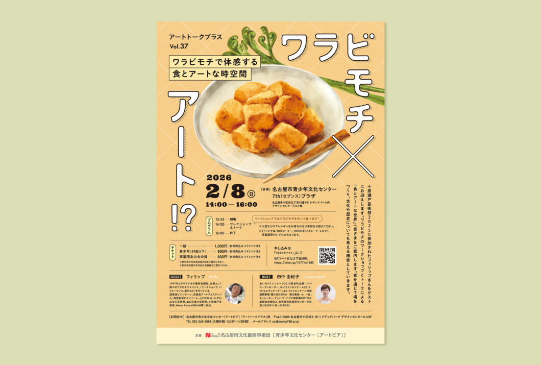 ナディアパーク青少年文化センターにて開催されたイベント、アートトークプラスvol.37「ワラビモチで体感する食とアートな時空間」のチラシをデザインさせていただきました。ワラビモチ作りのワークショップやトークを通じて、食とアートを感じるイベントです。